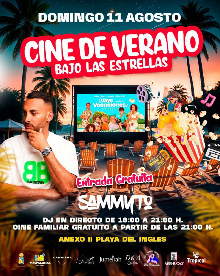 Om het weekend compleet te maken, verandert het strand van Playa del Inglés op zondag 11 augustus in een Zomerbioscoop Onder de Sterren om samen met het gezin te genieten van de film ‘Vaya Vacaciones’. Zo begint de zondag om 18:00 uur met het optreden van DJ Sammyto die de avond zal opvrolijken, en om 21:00 uur begint de gratis vertoning van de familiefilm. Om van deze sessie te genieten, wordt aangeraden om strandstoelen of dekens mee te nemen om comfortabel van de film te genieten.